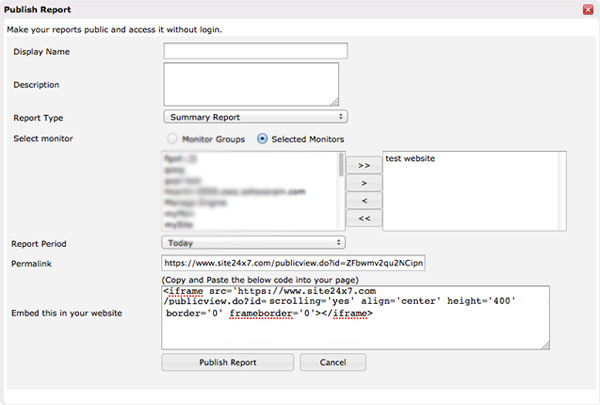 You can embed reports in your website using an iFrame or publish reports via a permalink. Publish report option is available in all the report types with Site24x7.